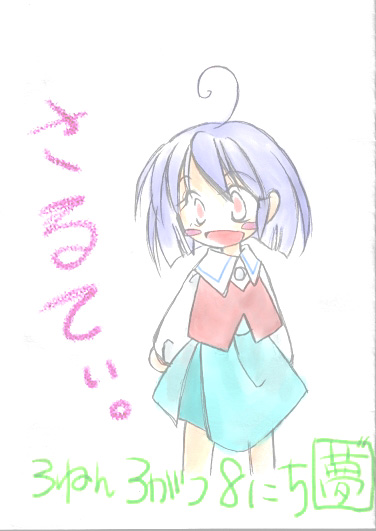 昔の落描きが見つかったので、引っ張り挙げてみる。 デフォルメ・サルティ。 日付書いてありますね。2003年。 確か、「ある朝起きたら、キャラが人形サイズに縮んでたら?」 という阿呆なネタを話してた時に描いたもの。 なので、ちびいです。 MENU