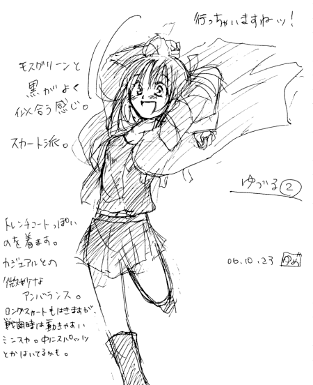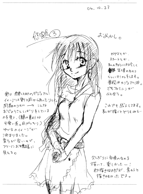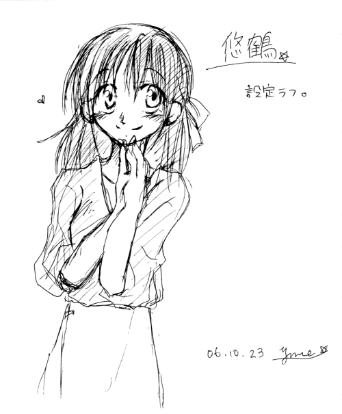 悠鶴の設定ラフ。 一応主人公ってことで、最初に絵がついたのがこやつ。 以下は初めて描いたラフ群ですが、日付見て解る通り大分古いです(汗) 周りに書き散らしてあるきったない文字は無理に解読しなくても何等支障ありません。